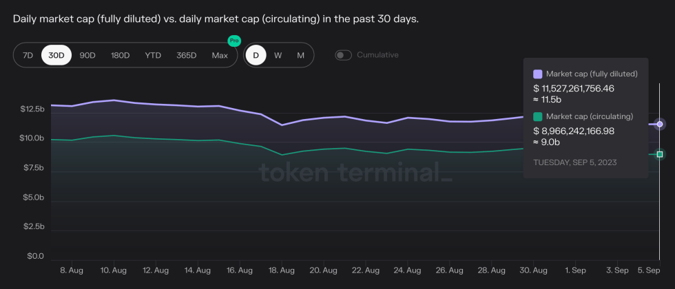 It translates to a nearly $5 billion decline, leaving the blockchain’s fully diluted market cap at $11.5 billion, contrasting with its circulating market cap of $9 billion.