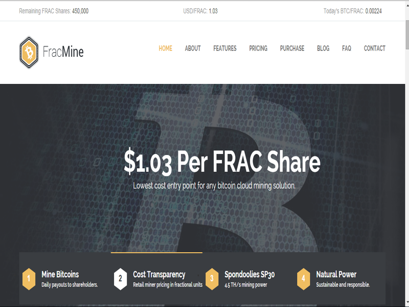 “Each FRAC share represents 1 Gigahash per second of the entire mining operation’s hashing power. After purchasing a fractional unit of the mining rig, the miners are operated in an environmentally friendly manner by using low cost, hydro-electric power. FracMine’s initial offering, “FRAC0914” shares, represent the combined hashing power of 100 Spondoolies SP30 miners running at a collective speed of 450,000 GH/s. Accordingly, FracMine is offering 450,000 FRAC0914 shares at $1.03 per share, the lowest price point in the cloud mining market. This price applies to each customer regardless of the number of shares purchased. FracMine’s FRAC0914 shares are 48% cheaper than CEX.io’s GHS offerings at approximately $1.98 per share.”