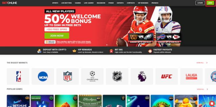 Go to betonline.ag on your desktop or mobile browser. Select “Join” at the top right corner of the homepage.