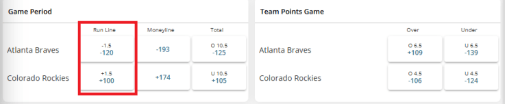 The spread of the game is referred to as the ‘run line‘ in baseball betting, and it is, as with the example, usually set at 1.5 runs. A bet on the Braves only wins if they win by two runs or more. If you bet on the Rockies instead, your bet still wins if they lose by one run, tie, or win the game.
