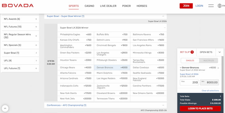 The Broncos have had a better past, but with the emergence of rookie quarterback Bo Nix and 2025 NFL Draft additions like Jahdae Barron and RJ Harvey, they could well turn the division on its head. Bovada offers a wide range of betting options on the NFL, as well as alternative leagues such as the UFL, college football betting, and the CFL.