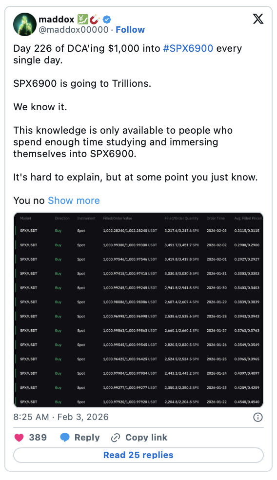 A meme coin investor going by the handle Maddox on X recently shared a series of transactions that showcase his dollar-cost averaging strategy in SPX.