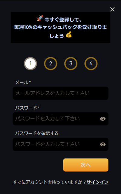 インスタントカジノの公式サイトにアクセスし、画面右上にある黄色の「登録」ボタンをクリックして登録フォームを開きます。
