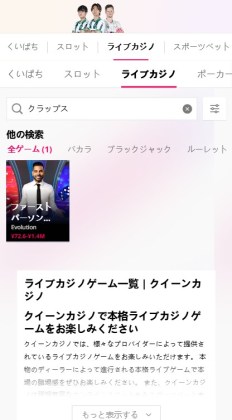 クラップスは「ライブカジノ」カテゴリから簡単にアクセスでき、リアルディーラーが進行するため、臨場感のあるプレイ体験が可能です。