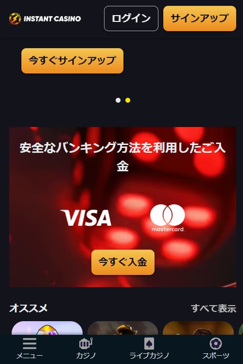 Visa・Mastercardに対応しており、カード入金後は即時にプレイを開始できるため、初めてのユーザーでも安心です。