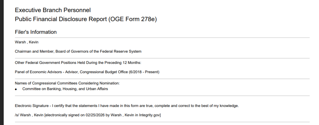 Based on reports, Warsh’s filing with the US Office of Government Ethics lists holdings in Compound, Dapper Labs, and Kinetic on the crypto side, alongside AI firms including Delphi, Conversion, Factory, and Glue, among others.