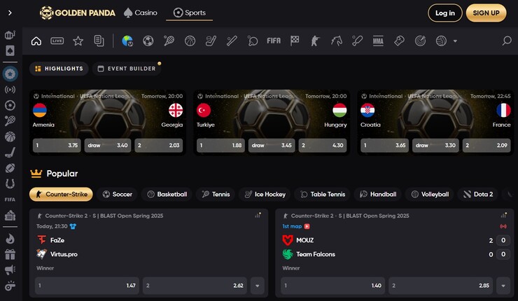 - Golden Panda – онлайн-сервис с большим выбором спортивных и киберспортивных состязаний и выгодным кэшбэком;