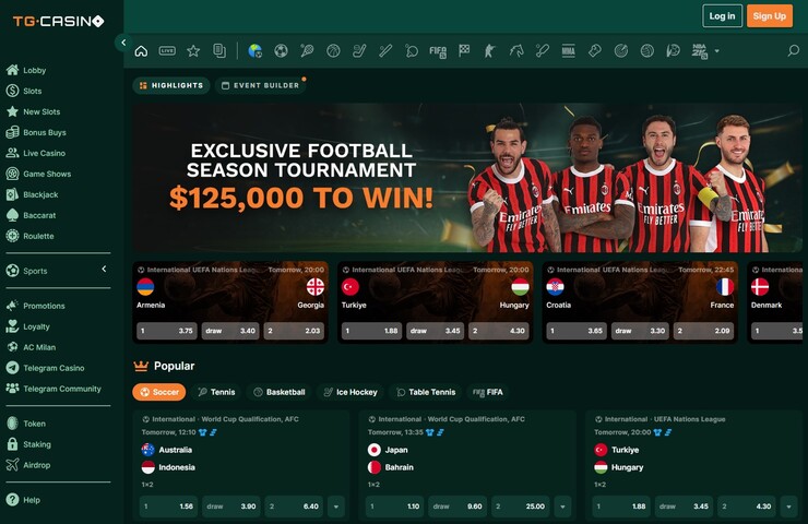 - TG Casino – платформа, где можно делать крипто ставки на спорт внутри мессенджера Telegram и получать щедрые бонусы;
