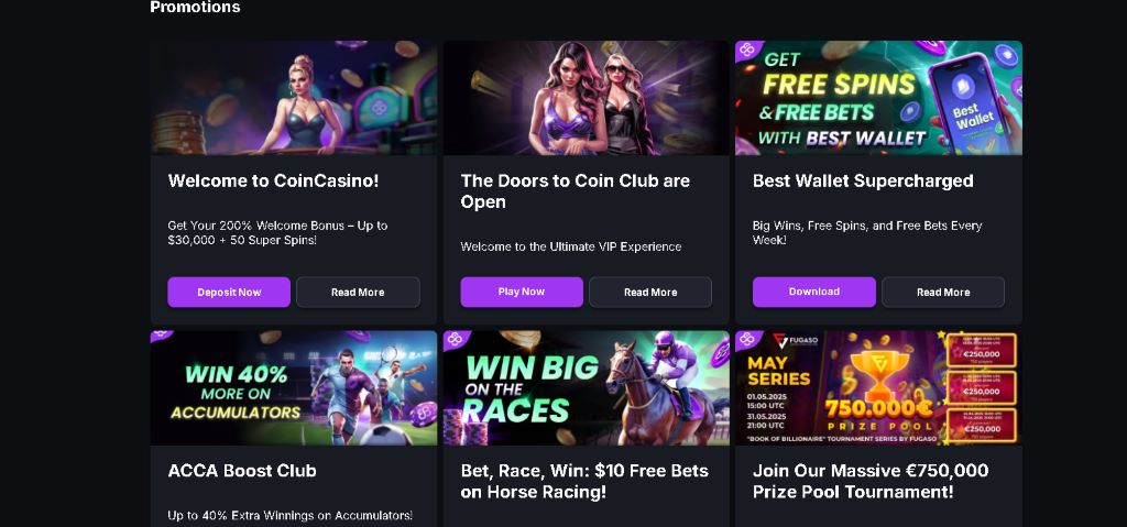 CoinCasino se pyšní širokou herní nabídkou a kvalitními poskytovateli her, jako jsou NetEnt, Pragmatic Play či Evolution. Tato platforma pokrývá vše od klasických výherních automatů až po živé stoly s dealery, což uspokojí jak začátečníky, tak i zkušené hráče. Kromě rozmanitého výběru her CoinCasino láká nové uživatele také atraktivními uvítacími bonusy, které zahrnují jak vkladové bonusy, tak i bezplatná zatočení. Platforma je dostupná i v češtině, což usnadňuje orientaci a registraci českým hráčům.