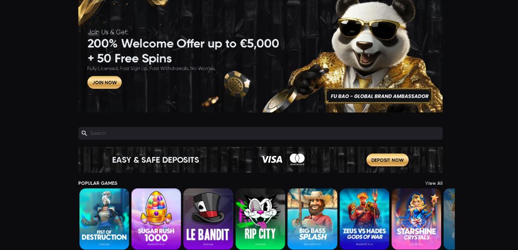 Το Golden Panda ξεχωρίζει με την ήρεμη και ζεν ατμόσφαιρά του, προσφέροντας μια μοναδική εμπειρία εμπνευσμένη από την ασιατική κουλτούρα. Η πλατφόρμα διαθέτει αποκλειστικές προσφορές σε κρυπτονομίσματα που ικανοποιούν τους παίκτες που προτιμούν τις ψηφιακές πληρωμές και αναζητούν ασφάλεια και ευκολία στις συναλλαγές τους.
