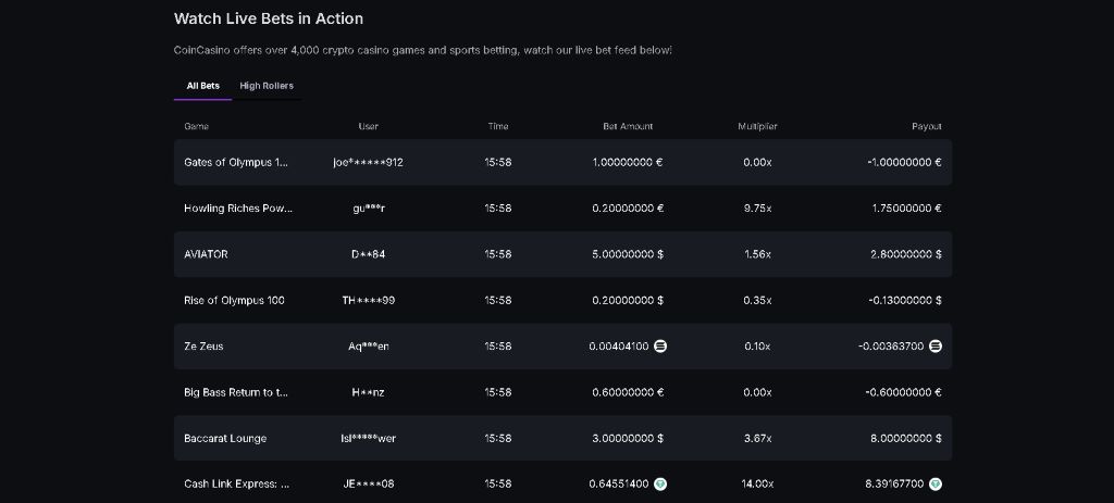 Το Coin Casino διακρίνεται για την εκτενή γκάμα παιχνιδιών που προσφέρει, συνδυάζοντας παραδοσιακά φρουτάκια με νέα καινοτόμα παιχνίδια. Η ποικιλία αυτή καλύπτει κάθε γούστο, από κλασικά παιχνίδια καζίνο μέχρι σύγχρονες ζωντανές εμπειρίες με πραγματικούς dealer, προσφέροντας μια ολοκληρωμένη εμπειρία ψυχαγωγίας στους παίκτες.