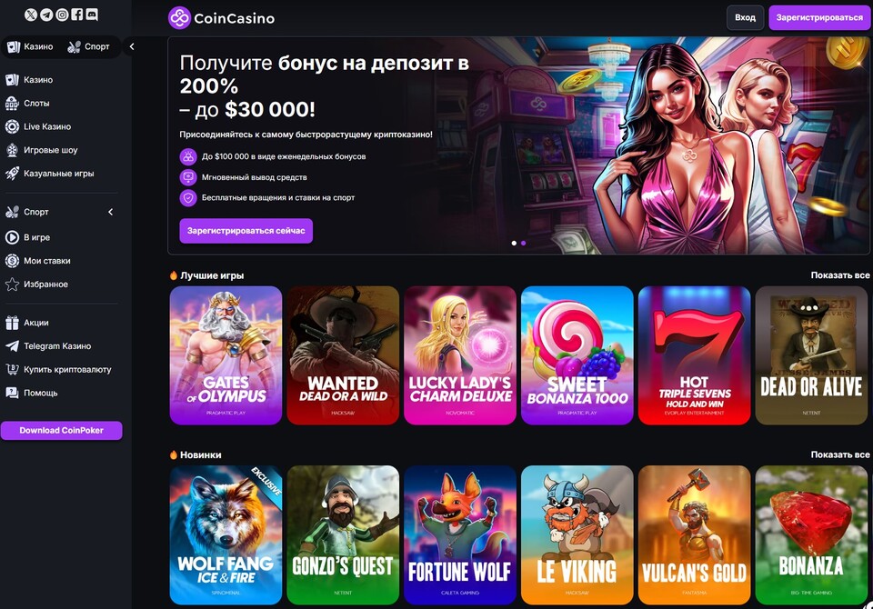 - CoinCasino – проверенное крипто казино с приветственным бонусами до $30 000, библиотекой из более чем 4 000 игровых слотов и поддержкой более 20 криптовалют (BTC, ETH, USDT и др.);