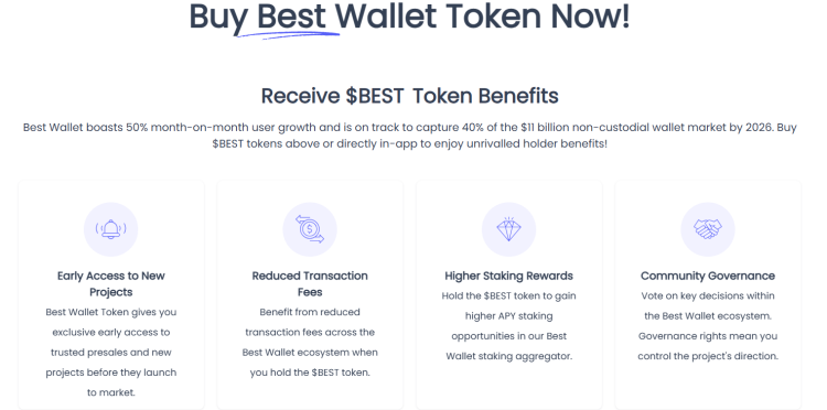 Met de eigen Best Wallet Token gaat het juist op deze gebieden extra voordelen bieden aan haar gebruikers. Zo worden de transactiekosten lager voor iedereen die de token hold en gaan de staking beloningen omhoog.