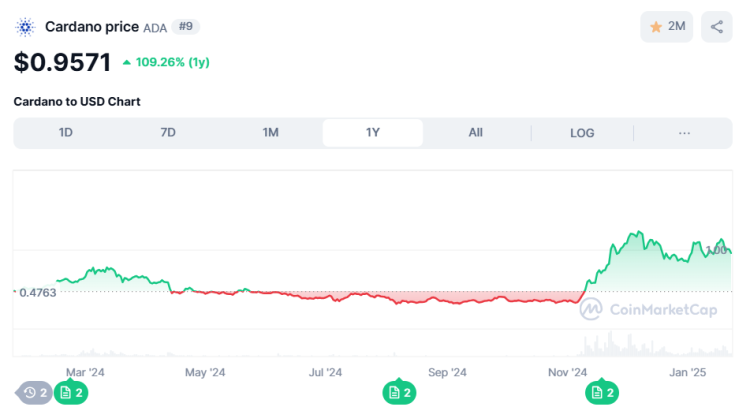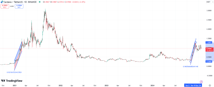 De huidige koers rond de $1 is nog altijd aanzienlijk hoger dan het de eerste 11 maanden van 2024 stond. In die periode leek de geest een beetje uit de fles bij Cardano en schommelde de koers lange tijd tussen $0,30 en $0,40.