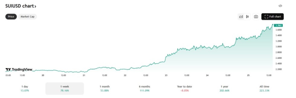 Nieuwe cryptomunten en opkomende cryptomunten hebben een lagere marktkapitalisatie, en kunnen daardoor wel dergelijke groeipercentages neerzetten. Een voorbeeld hiervan is SUI, een opkomende crypto die deze week met liefst 78% kon groeien.