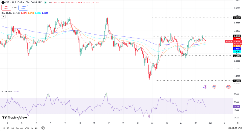 In de afgelopen 24 uur deed Ripple opnieuw een poging om de $2,21 te doorbreken, maar kon het bullish momentum helaas niet doorzetten. Uiteindelijk zet XRP daarmee zelfs een lichte daling neer van 0,27% ten opzichte van gisteren rond deze tijd.