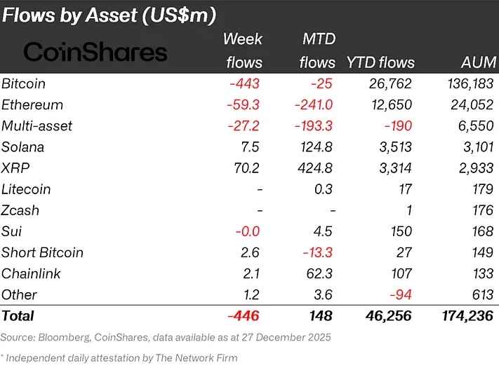 隨著 2025 年步入尾聲,加密貨幣市場展現出一種極其矛盾的景觀。儘管比特幣在今年曾觸及歷史高點,但根據 CoinShares 的最新數據,全球加密貨幣投資產品在上週錄得高達 4.46 億美元的淨流出。這一數據不僅延續了自 10 月中旬以來累計32億美元的撤資趨勢,更揭示了機構投資者在面對年終市場不確定性時,正展現出前所未有的謹慎情緒。然而,在這一片「失血」的紅字中,XRP 與 Solana 的表現卻如同一抹異軍突起的亮色,預示著市場資金的審美偏好正在發生根本性的位移。