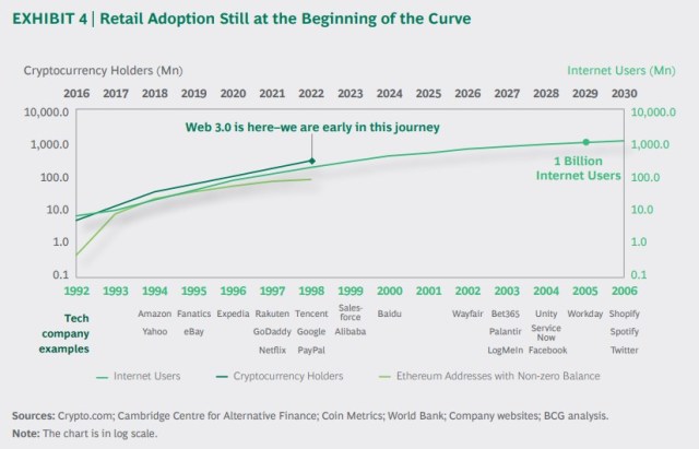 As seen below, the report concluded that crypto holders are projected to grow up to 1 billion by 2030 if the nascent asset class follows a similar trajectory to that of the internet. In these terms, digital asset adoption stands at something like the internet in 1998.