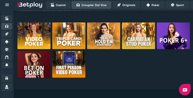 La sezione poker BC è stata aggiunta di recente e il palinsesto tornei è ancora in fase di sviluppo. Gli appassionati di poker in criptovaluta possono accedere a una vasta selezione di 90+ varianti di poker live nel casinò, tra cui Caribbean Hold’em, First Person Video Poker, Turbo Poker, In Between Poker e Jacks or Better.