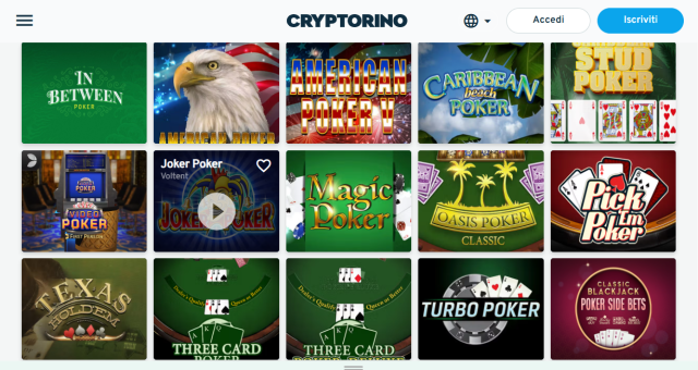 | Opzioni crypto poker online | Caribbean Hold’em, First Person Video Poker, Turbo Poker, In Between Poker e Jacks or Better |