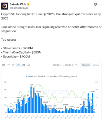 Venture capitalists went all out in Q2 2025, pouring a massive $10B into the space according to Satoshi Club on X. That’s the biggest quarter since way back in 2022.