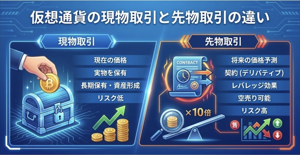 最大の違いは「資産の所有権」の有無。現物取引は実際に仮想通貨を保有・送金できますが、先物取引は将来の価格差のみを清算する「差金決済」方式です。