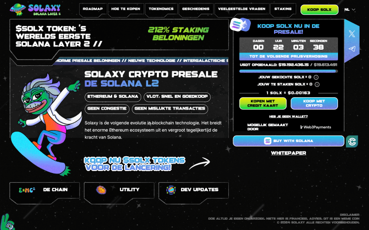 Als je ook als vroege investeerders wilt instappen in de ‘opvolger van Solana’ dan heb je nog tot morgen de tijd om je eerste SOLX-tokens te bemachtigen voor de lage prijs van $0,00163 per token. Daarna gaat de volgende fase van de presale in en dan komt er weer een nieuwe prijsverhoging aan. Op de officiële website van Solaxy kun je eenvoudig je wallet koppelen en betalen met crypto en je creditcard.