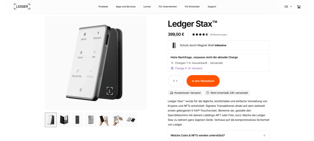 - Ledger Stax – Най-новият премиум портфейл на Ledger с голям сензорен екран, EMI защита и EAL 6+ сертификат
