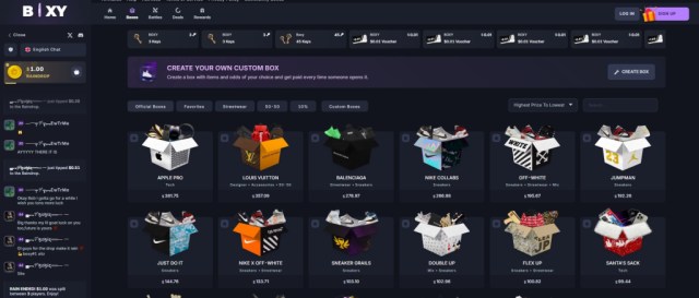 La fel ca și Hypedrop, BOXY îți oferă funcția de Free Spin pentru a testa șansele cutiei fără nici un risc. Fiecare cutie misterioasa de la BOXY poate conține până la 20 de articole. De asemenea, prin funcția Custom Boxes, site-ul îți permite să-ți personalizezi cutia, alegând articolele din conținut și ajustând șansa de câștig. Cutiile personalizate sunt făcute publice și ești plătit de fiecare dată când cineva îți deschide cutia.