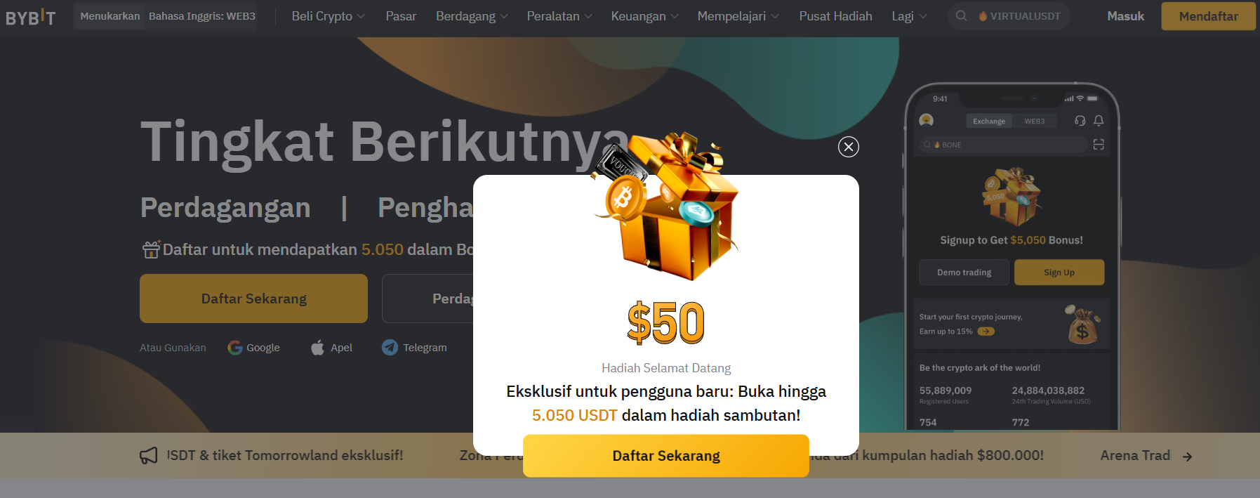 - ByBit – Salah satu exchange terpopuler dengan crypto bonus hingga 30.000 USDT khusus untuk pengguna baru.