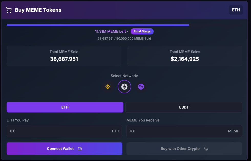 - Metode pembelian: ETH, USDT, USDC, BNB, SOL, kartu