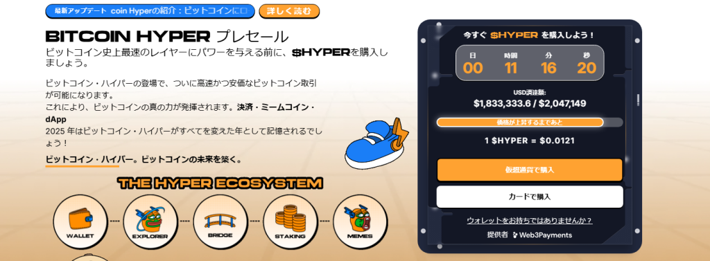 Bitcoin Hyperは、ビットコインの主な課題に対応する、初かつ唯一のレイヤー2(拡張レイヤー)ソリューションである。Solana Virtual Machine(ソラナ仮想マシン)の技術を活用し、Solanaのような高速処理をビットコインに実現する。さらに、遅延と手数料も低減される仕様となっている。