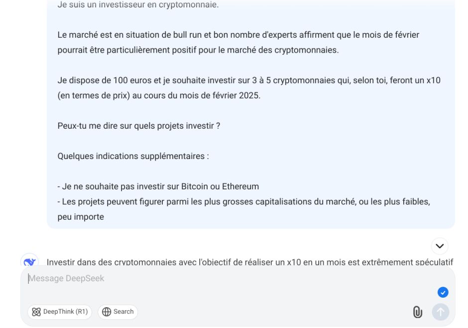 Pour parvenir à obtenir une liste de cryptomonnaies qui pourraient réaliser un x10 au cours des prochaines semaines, nous nous sommes connectés à la plateforme DeepSeek.