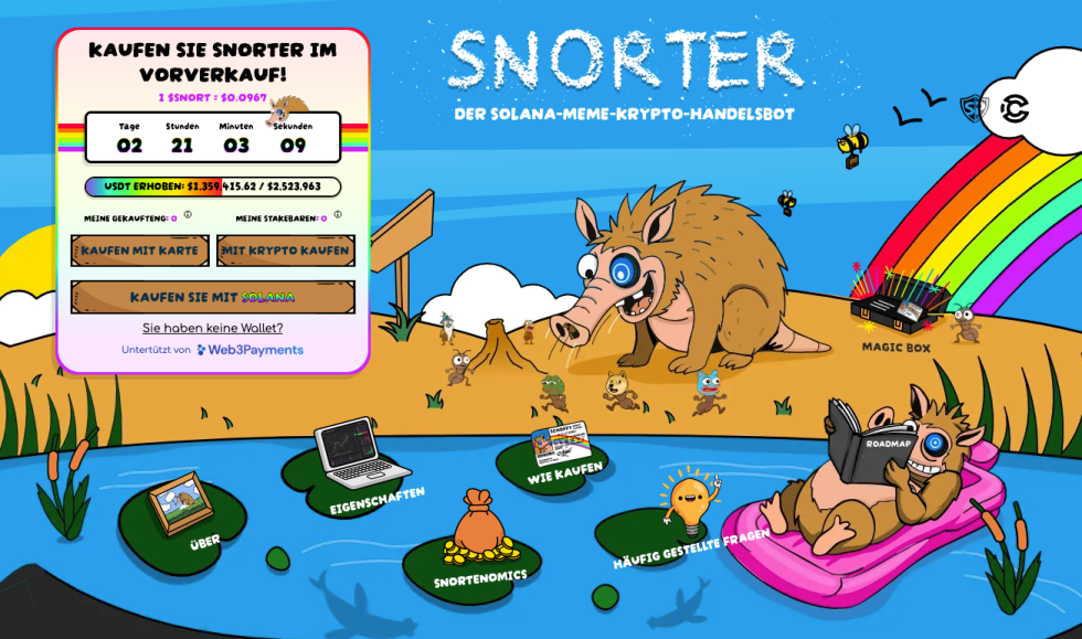 Auch SNORT wird heute von vielen Tradern zu den potenziell besten Meme Coins im Juli gezählt. Ähnlich wie BTCBULL befindet sich der Coin noch ganz am Anfang seiner Entwicklung und kann heute ausschließlich über den Presale gekauft werden, der über die offizielle Website des dahinter stehenden Projektes Snorter läuft.