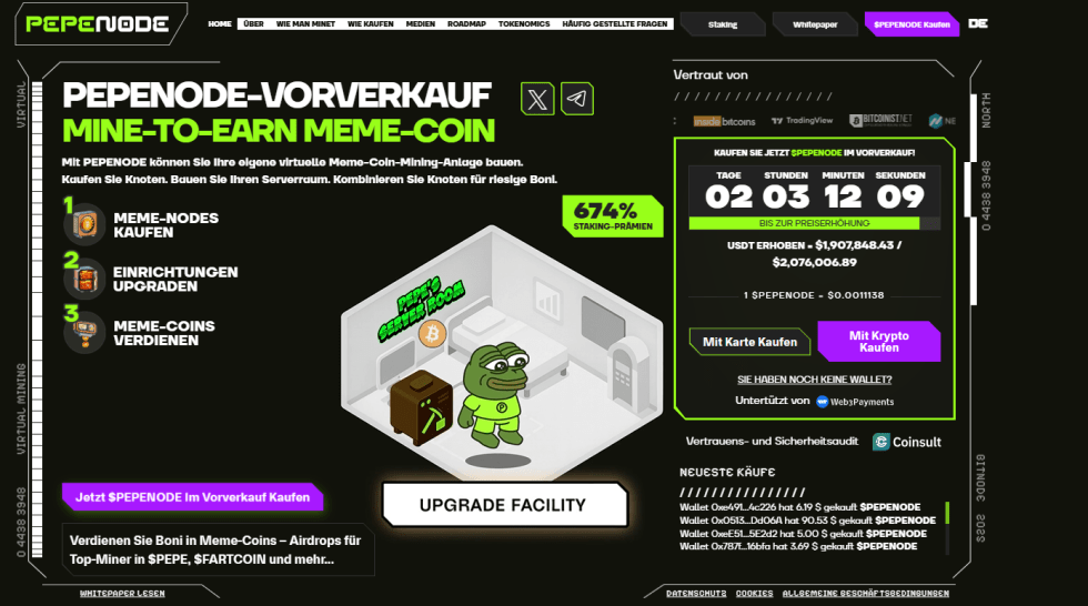Anstatt wie Bitcoin enorme Strommengen zu verbrauchen, setzt PepeNode auf ein virtuelles Mining-System, bei dem Nutzer Meme Coins wie Pepe (PEPE) oder Fartcoin (FARTCOIN) „minen“ können. Das Ganze funktioniert spielerisch, effizient und komplett ohne Hardwarekosten.