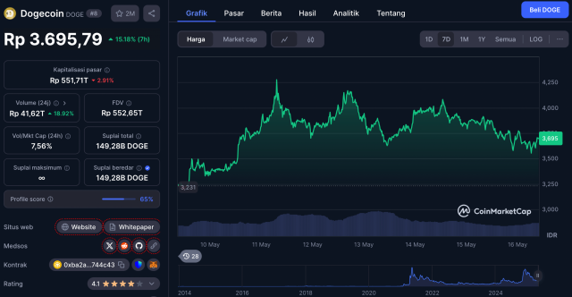 Dogecoin kembali menjadi pusat perhatian. Saat ini, DOGE diperdagangkan pada kisaran $0,2492—menguat 53% dalam 30 hari terakhir. Kapitalisasi pasarnya mencapai sekitar Rp550 triliun, dengan volume perdagangan harian menembus Rp41,7 triliun.