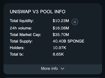 - SPONGE’s locked liquidity with Team Finance speaks for its credibility. It rules out all concerns of rug pulls and scams the meme coin market is notorious for. PEPE has been facing liquidity challenges since its demand gained momentum.