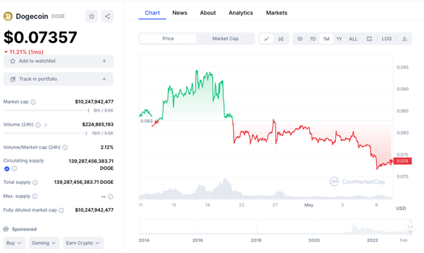 Dogecoin 1-month price overview, 10 May 2023, CoinMarketCap