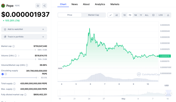 Pepe seven-day price overview, 10 May 2023, CoinMarketCap
