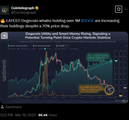 온체인 분석 플랫폼 센티먼트의 데이터에 따르면, 100만 도지코인 이상을 보유한 고래 지갑의 수가 증가하고 있는 것으로 나타났다. 또한 활성 주소가 급증하고 있어, 전반적인 시장 상황이 안정화될 경우 이는 곧 상승세 전환의 잠재적 지표가 될 수 있다고 분석했다.