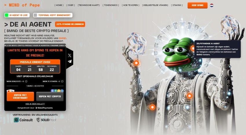 MIND of Pepe bewijst dat meme coins meer kunnen zijn dan alleen hype. De presale heeft tenslotte al meer dan $10 miljoen opgehaald. Tokens zijn momenteel te verkrijgen voor $0,0037515 per token. Let alleen op, de presale loopt nog een paar dagen, wees er dus snel bij als je nog wil profiteren van dit innovatieve meme project.