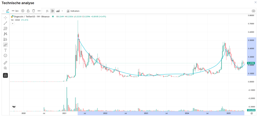 De berekening van het patroon is vrij eenvoudig te begrijpen. De diepte van de cup bedraagt ongeveer 92%, en die afstand wordt bij een breakout bovenop het weerstandsniveau geprojecteerd. Dit resulteert in een koersdoel dat bijna drie keer zo hoog ligt als de huidige prijs. Op het moment van schrijven bevindt DOGE zich rond de $0,22, wat betekent dat er in theorie ruimte is voor een stijging van meer dan 285%.