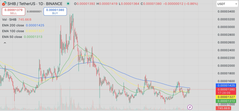 200-дневната EMA дълго време е определяла тенденцията на $SHIB. Пробивът ѝ с устойчив обем може да отвори път към $0.000015 и потенциално до $0.00002.
