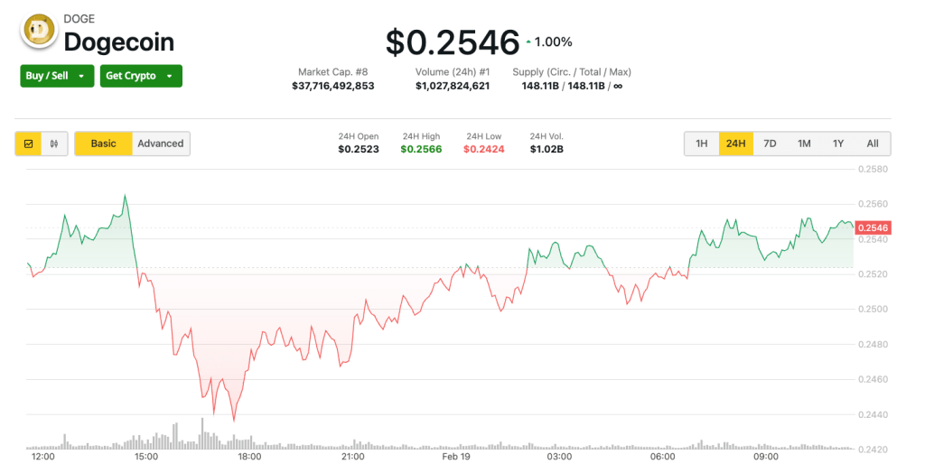 ปัจจุบัน Dogecoin ซื้อขายอยู่ที่ 0.25 ดอลลาร์ ลดลง 4% ในช่วงสัปดาห์ที่ผ่านมา