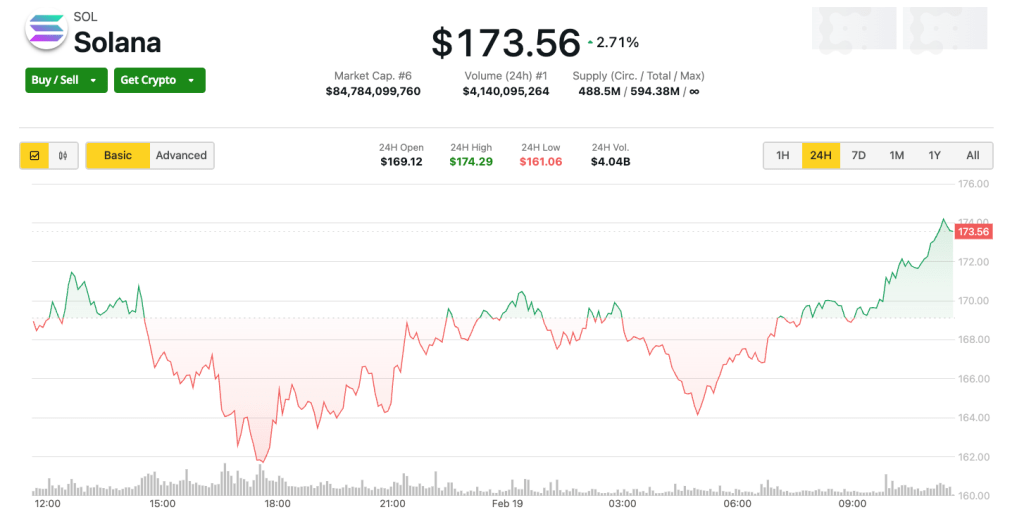 ปัจจุบัน Solana ซื้อขายอยู่ที่ 173 ดอลลาร์ ลดลง 15% ในหนึ่งสัปดาห์
