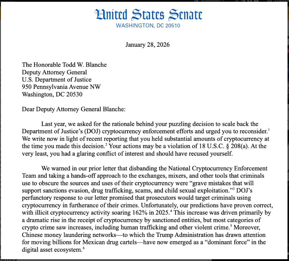 The Justice Department’s move last year to shut a specialized crypto enforcement team is drawing fresh fire after six US senators pressed the deputy attorney general for answers about his personal stakes in digital assets.