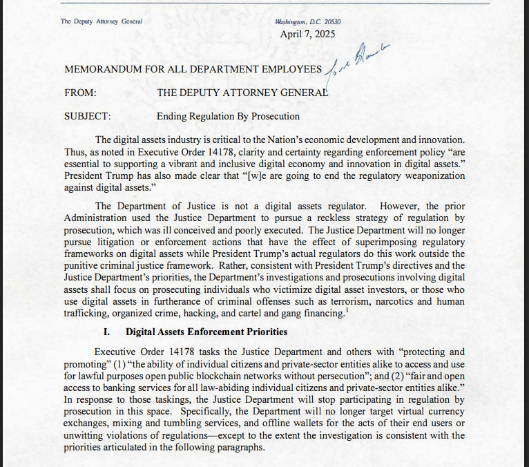 The memo at the center of the row told prosecutors to stop using enforcement actions as a kind of regulation. It said the department is “not a digital assets regulator” and ordered the NCET closed, shifting focus to crimes like trafficking, terrorism, and fraud that use crypto as a tool. That memo came from Blanche in April 2025 and marked a sharp change in how US prosecutors would treat many crypto cases.