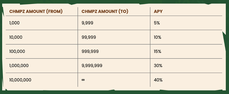 Those staking can earn up to an impressive 40% APY for locking their $CHMPZ away. The more $CHMPZ locked, the higher the APY return. The following table breaks down what stakers can expect to earn based on $CHMPZ;