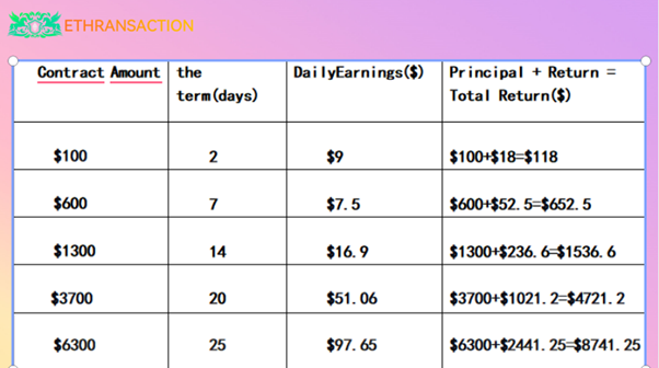 2. Reliable daily income: ETHRANSACTION provides stable daily income that grows with the size of your investment. Regardless of the size of your investment, users can get generous returns every day. There is no need for complex configuration to make money with ETHRANSACTION – just choose the contract that suits you and start making money.