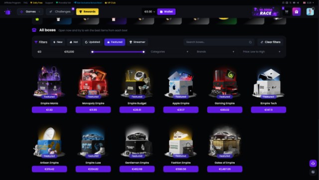 The UI is sleek, easy to navigate, and built for fast spins. You’ll find everything from high-end gadgets and fashion items to gamer gear and collectibles, sorted into boxes that actually reflect your interests and price range.